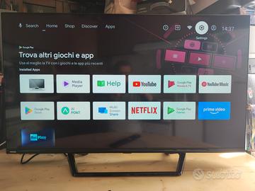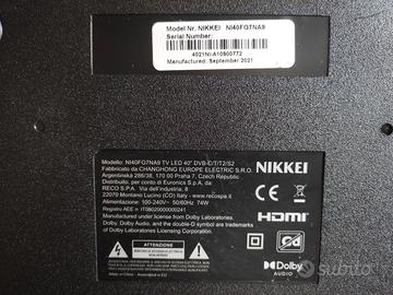 vendo Full HD, Wi-Fi LED Smart TV Nikkei NI40FG7NA9. schermo 40 polici. contelecomando. tutto funziona. Tv 40" ( LED ) App preinstallate Smart TV Full HD Black NI40FG7NA9. Dimensione schermo 40 pollici. Risoluzione massima display fino a Full HD 1080p. Schermo con tecnologia LED. Porte di collegamento HDMI, CI+, USB, LAN, Uscita cuffie. Aggancio staffa VESA 200 x 200 mm. Peso netto: 6,1 Kg.