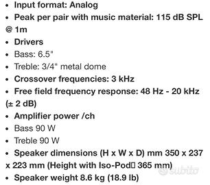 Vendo questa coppia di monitor favolosi 180 Watt (90+90). Condizioni eccellenti, usate solo in casa e complete di imballo.