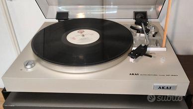 Giradischi AKAI del 1981. Trazione a cinghia nuova, con ritorno del braccio automatico. Testina e puntina, entry level, nuove. In alternativa la testina originale Akai con puntina da cambiare. Coperchio integro ma con cerniere che non tengono sollevato.