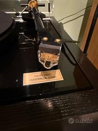 Telaio flottante su 3 molle, braccio unipivot Audiomeca Romeo e testina MC YBA Diva con circa 100 ore di suono, quindi praticamente nuova. La macchina è stata oggetto di interventi multipli di upgrade e manutenzione a Febbraio del 2026, quali: ricalblaggio braccio con cavi litz hi-end, sostituzione connettori rca femmina con unità audiophile, sostituzione supporti motore e supporti molle, lubrificazione e ingrassaggio di perno, alzabraccio e motore (spesa: 400€). Condizioni perfette in tutto! Non accetto permute o scambi. No a curiosi e perditempo. Non spedisco, data la fragilita dell’oggetto.