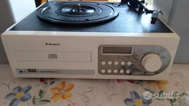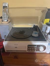 Piatto Giradischi - 3 velocità - Trazione a cinghia - Braccio dritto - Lettore CD - Coperchio - Con memory card reader - USB - Registrazione su dispositivo USB e SD CARD (in formato MP3) da Giradischi/CD/Cassetta Riproduzione musica (in formato MP3 e WMA) da dispositivo USB e SD CARD Lettore CD compatibile con CD, CD-R, CD-RW, MP3 Funzione PROG per programmare l'ordine di riproduzione dei brani (CD/USB/SD) Cassetta Auto-Stop con Avanzamento veloce (FF) , tasto espulsione cassetta (EJ)