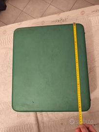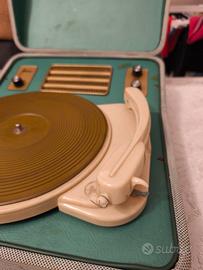 Prodotto dall'azienda italiana Nuova Faro di Milano, risalente agli anni '50/'60. Presenta manopole per la regolazione di "Volume","Bassi" e "Acuti", indicando il livello di controllo del tono. Il design a valigetta, con finitura verde acqua e griglia dell'altoparlante dorata, tipico dell'estetica dell'epoca. Funzionano sia amplificatore che rotazione del piatto da revisionare