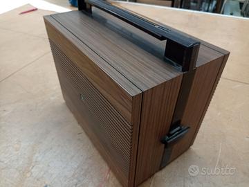 Giradischi stereo vintage portatile anni 70/80 con amplificatore integrato e 2 altoparlanti esterni per dischi in vinile a 33 - 45 -78 giri. Struttura con finitura legno tinta noce.