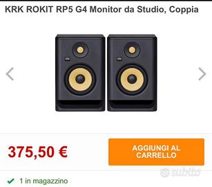Vendo coppia di monitor da studio KRK Rokit RP5 G4, nuovi, mai utilizzati, solo estratti dalla confezione per scattare alcune foto. Prodotto originale, perfettamente funzionante, ideale per studi di registrazione, produzioni musicali e DJ set. Condizioni: nuovo Incluso: coppia di casse + cover protettive Prezzo di listino: 375,50 € Prezzo richiesto: 299 € Spedizione disponibile in tutta Italia (anche con pagamento sicuro Subito) Pagamento accettato: PayPal, carta, contanti alla consegna su Roma. In omaggio, un accessorio o gadget Pioneer DJ o Technics come segno di cortesia per chi acquista la coppia.