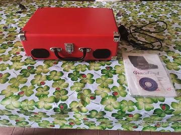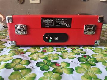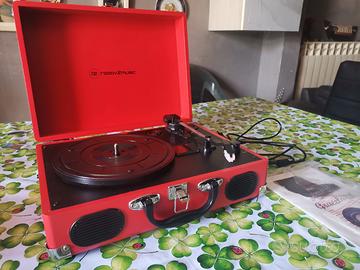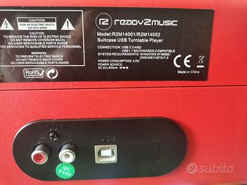 VENDO GIRADISCHI VALIGETTA READY2MUSIC USB ROSSO - 50€* Giradischi portatile formato valigetta con casse stereo integrate e uscita USB per digitalizzare i vinili. Condizioni: *ottime*, pari al nuovo, completo di alimentatore originale. QC PASS. *Caratteristiche tecniche:* - *Modello*: Ready2Music R2M14001/R2M14002 Suitcase USB Turntable - *Velocità*: 33, 45, 78 giri con auto-stop - *Audio*: Casse stereo integrate + uscita cuffie + uscita RCA L/R per collegarlo a un impianto - *USB*: Porta USB 2.0 per collegarlo al PC e convertire i vinili in MP3 - *Alimentazione*: DC 5V 500mA, 2.5W - trasformatore incluso - *Extra*: Maniglia e chiusure cromate, puntina ceramica - *Colore*: Rosso Testato e funzionante su tutte le funzioni. Zero graffi, usato pochissimo e tenuto in casa. *PREZZO: 50€ NON TRATTABILI* *Ritiro a mano a LATINA e zone limitrofe. Spedizione possibile a carico dell'acquirente.*