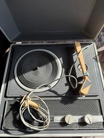 Giradischi vintage a valigetta con radio integrata, stile anni ’60/’70.