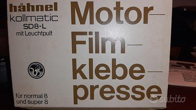 Giuntatrice incollatrice Hähnel MotorFilm Klebe Presse Kollamatic SD8. Giuntatrice per film 8 mm e super 8 a batterie (2 pile da 1,5 V non incluse) con istruzioni in varie lingue nella sua confezione originale. Funzionante. Le foto sono parte integrante della descrizione