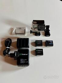 Vendo GoPro Hero 4 Black Edition perfettamente funzionante, usata poco, completa di tutto. Nel prezzo includo: * Kit accessori completo come in foto: supporti vari (torace, testa, bici, ventosa, monopiede, ecc.), pronto per ogni sport o viaggio. * GoPro Smart Remote nuovo originale per comandarla a distanza. •2 batterie aggiuntive con stazione di ricarica per 3 batterie totali. •Zaino fotografico Case Logic in regalo, dove ci sta tutta l’attrezzatura, più un porta GoPro da viaggio. Perfetta per chi vuole un set completo “prendi e vai”, niente da comprare a parte.