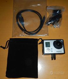 Go Pro modello Go pro Hero 3 Silver, usata ma come nuova è comprensiva di moltissimi accessori come da foto allegate,schermo go pro originale per fare la modifica e aggiungere la batteria maggiorata originale,due batterie nuove in confezione,più a quella sulla go pro un caricatore originale per batterie go pro,treppiede , scheda sandisk da 32 gb installata, cavo per ricarica, una struttura in metallo per go pro,manuale d'uso originale,comprensivo della scatola di acquisto:Caratteristiche: Registra fantastici video con risoluzione 1080 p30 scatta foto con risoluzione 5 mp W ifi e Bluetooth per connetterti con GoPro App Smart porta hdmi e mini usb,lente grandangolare.