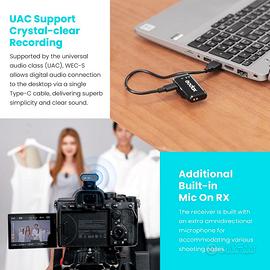 Il ricevitore è dotato di un microfono omnidirezionale aggiuntivo. Ciò ti consente di acquisire audio di alta qualità sia dal soggetto che stai filmando che dalla persona dietro la telecamera senza la necessità di un trasmettitore aggiuntivo, ideale per vlog, interviste e documentari.