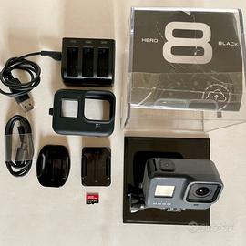 Vendo GoPro8 Hero Black, In ottime condizioni! Perfettamente funzionante, senza particolari segni di usura. Completa di caricabatterie a tre slot, supporti adesivi, scheda di memoria, guscio antishock!