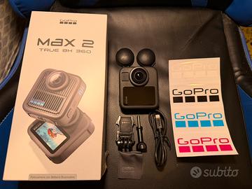 Cosa è incluso: fotocamera MAX2, 2 copriobiettivo protettivi, batteria Enduro da 1960 mAh, supporto gopro, cavo USB-C, panno in microfibra per lenti, adesivi e manuale