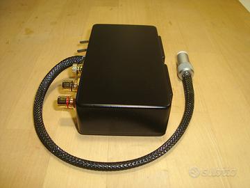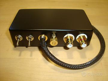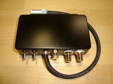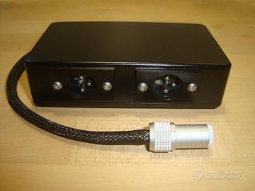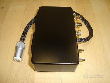 Scatola derivazione per bracci Graham/SME/Linn/Jelco e altri, DIN dritto tipo Tiffany, cavo di collegamento al braccio lungo 32cm, possibile selezionare con uno switch (ON/OFF) lo schermo sul cavo braccio e con altro switch il funzionamento RCA o XLR, cablaggio in argento estruso (OHNO Casting) 24 AWG, uscita RCA in puro rame non ottone, XLR silver, box alluminio pressofuso.