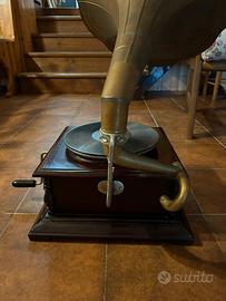 Grammofono d’epoca con corpo in legno lavorato e tromba in ottone, modello Oggetto da collezione perfettamente conservato, con ricambi originali.