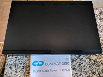 Il CD 8100 ed il CD 8200 sono gli ultimi lettori full CCI prodotti da Grundig, con la significativa differenza che il primo ha costituito uno dei primi CD player NOS (No Over Sampling) e forse l'unico di un certo livello - almeno a mio personale parere - prodotto all'epoca. Prodotto dal 1987 al 1989, quello in vendita rappresenta una delle ultime serie e, in quanto tale, è munito di una meccanica laser CDM4 /25: un classico tra i sistemi a braccio oscillante a raggio singolo, La semplicità circuitale, unita alla sostituzione completa dei condensatori elettrolitici (con condensatori a lunga durata e basso ESR - Rubycon e Panasonic - in ogni dove, come illustrato nelle foto a corredo dell'inserzione), oltre a garantire un elevato numero di anni di buon funzionamento, garantisce anche una qualità d'ascolto insospettabilmente elevata. Ciò anche grazie alla sostituzione dei condensatori in uscita (di qualità mediocre) con due pregevoli WIMA a film plastico. Nella foto 4 è illustrata la scheda logica a supporto dell'ottica, mentre nella foto 5 è illustrata la PCB principale; nella foto 6, oltre alla PCB principale, è riportata la scheda di controllo del display nella quale si nota un condensatore assiale che a causa del maggiore ingombro - per la sua maggior qualità rispetto a quello sostituito - non è stato possibile inserire a ridosso del led interno: non sarebbe stato possibile fissare la relativa PCB a ridosso del frontale. Si precisa che sono stati rispettati in tutto e per tutto i valori originali dei condensatori e che, al di là della maggior qualità della componentistica impiegata, non è stata introdotta alcuna variazione progettuale. Al CD player verrà allegato manuale d'uso e cavo di alimentazione mentre manca un telecomando, che potrà facilmente essere reperito nel mercato dei telecomandi sostitutivi.