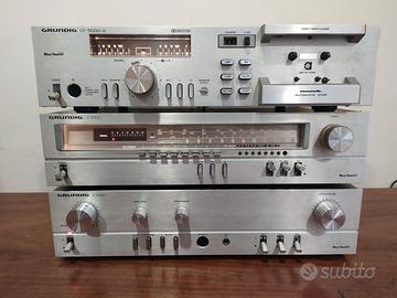 VENDO TRIS DI APPARECCHI GRUNDIG IMPIANTO HI-FI VINTAGE ANNI '80. COMPOSTO DA AMPLIFICATORE STEREO HI-FI MODELLO V1000, POTENZA DI 35 WATT, TUNER/SINTONIZZATORE RADIO MODELLO T1000, TRE BANDE RADIO, STAZIONI MEMORIZZABILI, PIASTRA CASSETTA/DECK CF5000-2.
