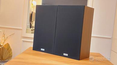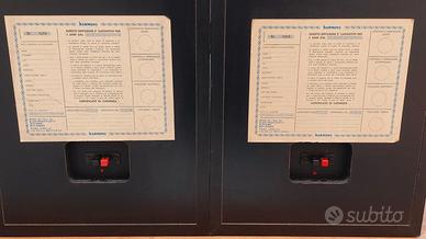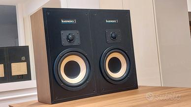 -DISPONIBILI- Infoline Whatsapp: 3319906753 Casse acustiche Hi-Fi HARMONY BLUE NOTE 3 anno 1984, in condizioni magnifiche completamente originali, no modifiche EURO 200 Sistema a 2 vie in cassa chiusa woofer Audax HIF24, diam.240mm, sospensioni sostituite a dicembre 2024 tweeter Audax HD12, diam.25mm, cupola trattata impedenza 8 ohm efficienza 89 db potenza di utilizzo 70 watt dimensioni 550x310x250 mm Italiane, molto francesi e con la voglia di essere americane. Harmony è stata la figlia biologica di ESB, un brand italiano che fece cose belle nel ventennio 70-80. Nata come una linea interna molto filo-americana perché priva di orpelli inutili al fine sonoro, Harmony diventò poi una sorta di spin-off ed ottenne riscontri commerciali di rilievo. In effetti, ESB all’epoca voleva dire altoparlanti di indubbia qualità, mobili molto ben fatti e suono altamente proteico: tutto molto yankee insomma. In questo caso, il progetto prevede ottimi altoparlanti della francese AUDAX, in sostanza una RCF d'oltralpe, crossover cablato in aria e mobili dallo spessore di ben 20mm. Woofer e tweeter hanno risonanza di soli 29 ed 800 Hz, e si possono definire veri veterani perché utilizzati da molti altri costruttori attraverso almeno 3 decenni. Il risultato sonoro di tutto questo è notevole: grande apertura della scena acustica e andamento timbrico dal mood neutro, magari un po’ ambrato. Impatto verace e fisico intorno agli 80-100hz, così da dare ritmo e fisicità a batteria e basso elettrico: scelta furba con generi moderni ma non solo, perchè anche nella musica sinfonica quelle frequenze sono abitualmente riprodotte da pianoforte, violoncello e basso tuba. Ma anche dal contrabbasso, strumento basilare nel classico trio jazz. In sostanza, queste belle Harmony Blue Note sono davvero un eccellente prodotto, ben progettato ed ingegnerizzato da menti capaci. Sotto il profilo sonoro, i difetti sono da cercare con il lanternino.