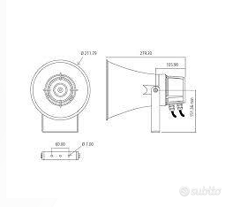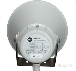 RCF HD 21EN è una tromba con potenza 30W certificata EN 54-24. Realizzata in materiale ABS resistente ai raggi UV e con grado di protezione IP66, è adatto sia per applicazioni al chiuso che all’aperto. Si può facilmente orientare grazie alla staffa di montaggio a parete regolabile, e può essere impiegato in sistemi installati in spazi molto grandi, come ad esempio supermercati, stazioni ferroviarie, metropolitane, industrie, magazzini, ecc. È dotato di trasformatore per linee a tensione costante 100V / 70V, selettore interno della potenza e morsetti ceramici per il collegamento dei cavi, ed ha anche un fusibile termico che impedisce danni alla linea audio a causa del calore. CARATTERISTICHE Tensione d’ingresso: 100 V – (70 V) Potenza: 30 W – 15 W – 7.5 W – 3.75 W Impedenza d’ingresso: 333 Ω (30W) - 667 Ω (15W) - 1.33 kΩ (7.5 W) - 2.67 kΩ (3.75 W) Risposta in frequenza: 340 Hz ÷ 9 kHz (–10 dB) Sensibilità: 104 dB (1 W, 1 m), 92 dB (1 W, 4m) Pressione sonora: 119 dB (30 W, 1 m), 107 dB (30 W, 4 m) Trasduttore: Compression driver da 38 mm Materiale: ABS Colore: Grigio chiaro Connettore: Connettore ceramico Grado di protezione: IP 66 Dimensioni: ø 212 mm, profondità: 279 mm Peso netto: 2 kg
