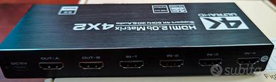 HDMI 4x2 può collegare quattro sorgenti di segnale HDMI a due schermi di monitor. Può facilmente cambiare e distribuire le sorgenti di segnale. Qualità video eccellente, risoluzione fino a 4K a 60 Hz. Questo dispositivo può passare da una sorgente di segnale all'altra tramite i pulsanti sul pannello o sul telecomando a infrarossi.