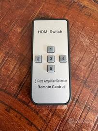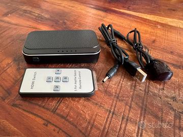 Switch HDMI con 5 ingressi, telecomando, cavo di alimentazione e cavo ricevitore a infrarossi.