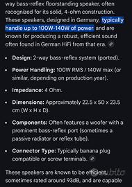 Propongo diffusori acustici HECO made in germany model int-reflex 20mk2..in ottime condizioni estetiche e perfettamente funzionanti, a 2 vie piu woofer passivo , BASS reflex, doppio woofer da 16cm, 140watt , 4ohm , 93db alta efficienza, ottimo tweeter high definition heco dome , componenti tele e loghi originali, il legno e in ottime condizioni, 9kg per cassa . Possibilità di ritiro a mano in zona Spedisco con ottimo imballo Vedi altri miei annunci come amplificatore, lettore cd , giradischi, casse e diffusori acustici, sintoamplificatore, radio tuner , dvd , piastra cassette, pre e finale , subwoofer, equalizzatore e altro materiale stereo hifi .