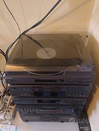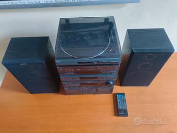 Vendo impianto stereo Hi-Fi Sony in ottimo stato composto dai seguenti moduli: 1. Giradischi Sony PS-LX60 Completamente automatico, trazione a cinghia (Belt Drive), motore DC a controllo elettronico.Velocità: 33-1/3 e 45 giri/min,, braccio bilanciato staticamente con testina MM (Moving Magnet) originale Sony inclusa. Dimensioni: 355 x 95 x 335 mm. 2. Lettore CD Sony CDP-M43 Con convertitore D/A 1-bit High Density Linear Converter, risposta in frequenza: $2Hz - 20kHz$ ($\pm 0.5dB$), con funzioni programmazione brani, shuffle, repeat. Uscita di linea RCA analogica. 3. Sintonizzatore Radio ST-D50L. Possibilità di memorizzare stazioni radio (Preset), con display fluorescente digitale con indicazione della potenza del segnale. 4. Piastra Doppia Cassetta DXA-D50 Con sistema a 4 tracce e 2 canali stereo. Funzioni Double Deck (Deck A per riproduzione, Deck B per registrazione/riproduzione). Sistema Dolby B NR La piastra a cassette richiede una revisione. 5. Casse Diffusori Sony SS-A50 Tipo: Sistema a 2 vie, Bass Reflex. Woofer: 120 mm a cono per le frequenze medio-basse. Tweeter: 20 mm a cupola/cono per le alte frequenze. Impedenza nominale: 6 Ohm. Potenza massima: 60W (Peak Power). Dimensioni: Circa 220 x 385 x 185 mm. Preferibile la consegna a mano