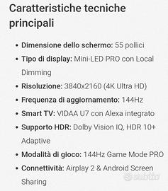 Vendo fantastica TV Hisense di alta fascia acquistata a dicembre causa trasferimento. La TV è perfetta, praticamente nuova, con scatola e tutti gli accessori originali. Solo scambio a mano e possibilità di visionarla e testarla. Astenersi affaristi e sognatori.