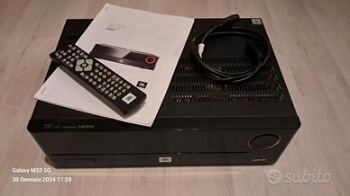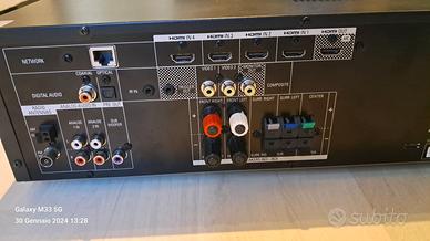 Ricevitore Audio Video Home Theatre 5.1 Perfetto in ogni dettaglio e completo di telecomando e confezione originale 4 ingressi HMDI abilitati al 4K 1 uscita HDMI ARC Due ingressi connettori AUX RCA Due ingressi digitali SPDIF e Toslink Ingresso Ethernet Uscita Subwoofer Funzioni radio AM FM, AUX 1 e 2, HDMI 1,2,3,4 Potenza 70 W RMS per canale