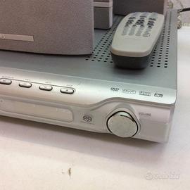 Lettore DVD Philips Home Theatre 5.1 HTS3500S Sistema surround 5.1 canali con potenza totale RMS di 500 W, decodificatori Dolby Digital e DTS inclusi. Lettore DVD/SACD (compatibile con formati DVD, DivX, MPEG4, CD, MP3-CD) e radio AM/FM. Include uscite audio/video posteriori con connettori Easy-fit™ codificati a colori per una facile installazione e per connessione con altri dispositivi. Anche funzione Karaoke.