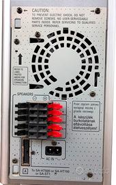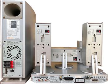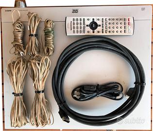Lettore DVD con sistema home theatre con amplificatore/subwoofer, 3 casse anteriori e 2 casse surround, completo di cavi e telecomando.