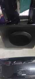 HOME THEATRE SAMSUNG HT A 100 N. 2 CASSE PER ALTI E N. 1 SUBWOOFER. UNA CASSA PRESENTA UNA PICCOLA AMMACCATURA.