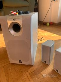 Sintoamplificatore Home Theatre Yamaha HTR 5930, perfettamente funzionante. Completo di 6 casse: 4 casse + cassa front+ subwoofer e della antenna per la radio integrata. Si può quindi usare sia come radio sia come amplificatore stereo sia come home theatre per i film.