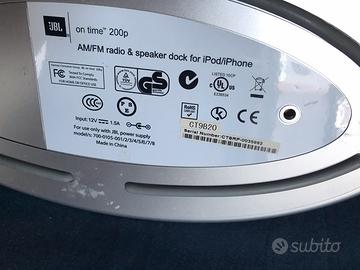 Jbl on time 200p ipod station radio am fm sveglia dock station ipod ingresso aux per collegamento con sorgenti esterne a minijack Perfettamente funzionante Completa di alimentatore originale Ipod ipad in foto non inclusi Spedizione 20 euro