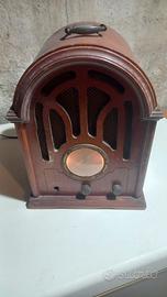 Si tratta di una imitazione di una radio vecchia, nella parte destra c'è anche il posto per inserire le musicassette. Manca di un pomello facilmente reperibile. Funzionante.
