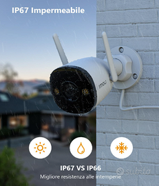 【Impermeabile IP67 & Connessione Wi-Fi stabile】Il grado protezione certificato per l’intrusione di corpi liquidi/solidi è IP67, la telecamera esterna wifi riesce a funzionare in condizioni da -30 a 50℃, resistente a intemperie come tempesta o neve. La distanza tra il router e la camera raggiunge fino a 15 metri nella casa. È compatibile solo con rete wifi da 2,4Ghz, non supporta 5Ghz.