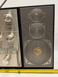 Radio FM AM, amplificatore stereo e registratore cassette integrati in un unico mini rack compatto dal design iconico. Le antenne sono presenti, le manopole originali, frontale molto scenografico con vu meter e tasti meccanici tipici dell’epoca.