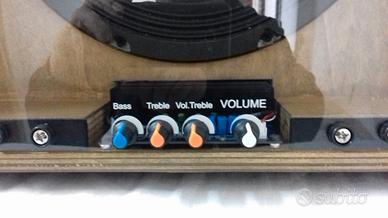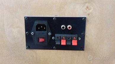 L'Unità centrale (Sub) ospita anche la scheda amplificatore posta volutamente a vista nel centro in basso dell'encosure dove vi sono i comandi principali composti da un volume generale, un volume per i due satelliti, un potenziometro per un minimo taglio di frequenza sugli stessi e un volume per il subwoofer. Mentre nella parte retrostante vi è la scheda che contiene la presa di alimentazione (220v) le uscite per i due satelliti e un ingresso RCA (Il cavo di alimentazione e i cavi ponte per i satelliti sono inclusi).