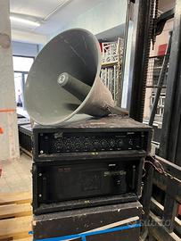 Vendo impianto 100 volt composto da 35 trombe , tre finali da 4000 watt e un pre amplificatore per comandare i finali con 4 entrate microfoniche e una entrata aux prezzo trattabile ideale per filodiffusione per fiere o grandi piazzali