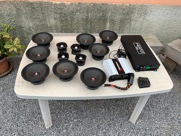 Buongiorno vendo vari componenti per impianto audio, utilizzati 6 mesi e cessata attività per vendita auto 8 woofer spl show da 20 cm 1 amplificatore hertz hp 602 2 sub kicker da 38 1500 rms l’uno 2 tasche per punto evo/grande punto