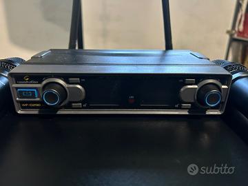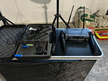 Impianto formato da : -Nr.2 casse LEM D400; -Nr. 1 Mixer Audiodesign pro Pmx 611 -Nr.1 Dual Microphone System wireless Soundsation WF-290 MKKII -Nr.1 Tavolo da Dj pieghevole Vevor -Nr.2 Stativi per casse 35 kg -Cavetteria varia per il collegare il tutto.