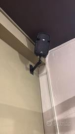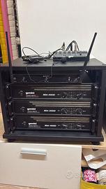 L’impianto è composto da 8 diffusori audio professionali, 3 amplificatori di potenza (configurazione 4 canali + 2 canali), mixer 8 canali con bluetooth e USB, sistema microfonico wireless con archetti e armadio rack.