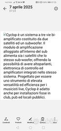 Vendo impianto audio marca LEM Causa inutilizzo. È un impianto potente, di buona qualità. Non è dotato di staffe e di mixer.