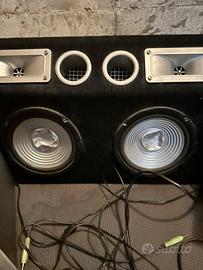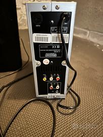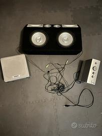 Impianto audio da casa con attacco jack composto da doppio subwoofer e cassa per gli alti il tutto gestito da un controller.