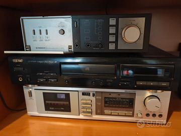 Vendo in blocco i componenti in foto: lettore di cassette TOSHIBA, lettore CD TEAC, amplificatore PIONEER (ha la caratteristica di consentire l' ingresso di un microfono o di una chitarra elettrica e di miscelare con la fonte sonora).