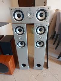 ottimo impianto hi-fi 5.1 composto da 2 torri + 2 casse posteriori + 1 centrale + sub preamplificato tenuto benissimo solo il centrale sarebbe da revisionare in quanto non ha la griglia di protezione e ha il twitter con la pancia spinta dentro ma tutto il resto è perfetto .