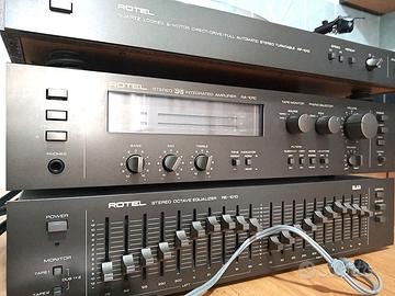 Amplificatore RA - 1010 (70 W per canale , può gestire due set di altoparlanti) + Equalizzatore RE - 1010 + Piatto a trazione diretta RP - 1010 + manuali d'uso + cartuccia Ortofon STM - 72 + Testina Godring 2100 + cuffia Pioneer SE - 205. Vendita in blocco, no componenti separate. Considerando il peso e la delicatezza del materiale, considerati i costi di spedizione, preferirei il ritiro in loco. Se fosse necessaria la spedizione per avere imballi sicuri è necessario effettuarla con tre imballi separati.
