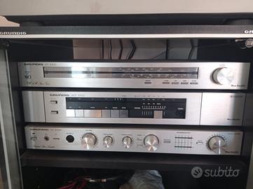 Vendesi splendido sistema Hi-Fi vintage completo , della prestigiosa marca Grundig, anni '80, perfettamente conservato e completamente funzionante. Un pezzo di storia dell'alta fedeltà tedesca, ideale per collezionisti o amanti del suono analogico. Il set è composto da: Giradischi Grundig PS 3500: Modello Direct Drive (trazione diretta) automatico, solido e preciso. Sintonizzatore ST 1000: Radio FM/AM con scala parlante analogica vintage. Piastra a cassette SCF 1000: Per l'ascolto e la registrazione dei tuoi nastri. Amplificatore Integrato SV 1000: Cuore del sistema, con controlli precisi per un audio caldo e pulito. Coppia di Diffusori Grundig: Casse a 2 vie con un'ottima resa sonora. Dimensioni: Casse (cad.): Altezza 48 cm | Larghezza 28 cm | Profondità 22 cm Mobile rack originale: Altezza 1,05 m | Larghezza 50 cm | Profondità Condizioni: L'intero impianto è stato testato ed è perfettamente funzionante in ogni sua parte (incluso il giradischi). Esteticamente si presenta in ottime condizioni, come da foto. Il mobile rack originale è dotato di vetro frontale protettivo e vani per riporre i tuoi vinili. Note: Solo ritiro a mano , data la delicatezza e l'ingombro dell'oggetto. Zona Lavarone Trentino Alto Adige