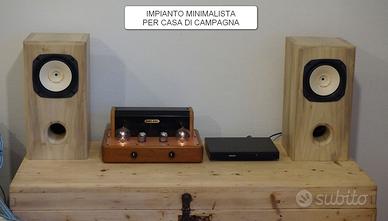 Il cuore dell'impianto è l'ampli valvolare ICARUS AUDIO del costruttore Pellas. Non molti Watt ma una resa sonora raffinata. E' affiancato da diffusori ralizzati a mano che montano monovia Fostex FE166En, molto efficienti, Si può vederne la costruzione su YouTube cercando "Bass Reflex con Fostex FE166En" . Per completare l'impianto, nel caso non si disponesse di una sorgente, è possibile abbinare il lettore Philips che si vede in fotografia.