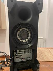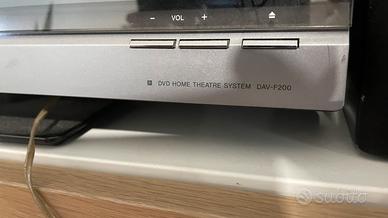 Impianto Sony per Home Theatre con effetto dolby surround, modello DAV-F200, perfettamente funzionante, con due casse, unità di gestione con slot cd-dvd, che legge anche mp3, jpg, munita di una porta usb, e unità amplificatore. Provvisto di tutti i cavi, con telecomando che funziona perfettamente tranne che per i tasti di gestione volume.