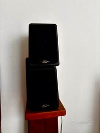 Amplificatore con 5 casse e due supporti in legno per sostenere i satelliti